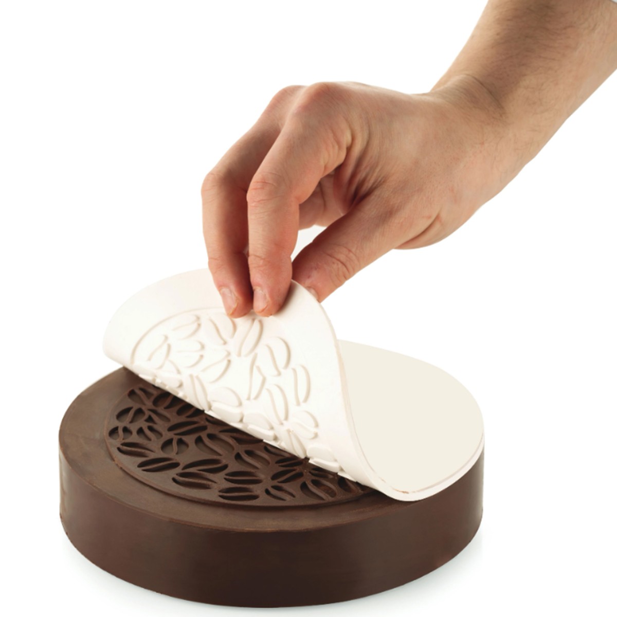 COFFEE DECOR е платинена силиконова форма, идеална за двойна употреба: за поставяне на декорации върху готови продукти и за щамповане на декорации директно върху продукта.