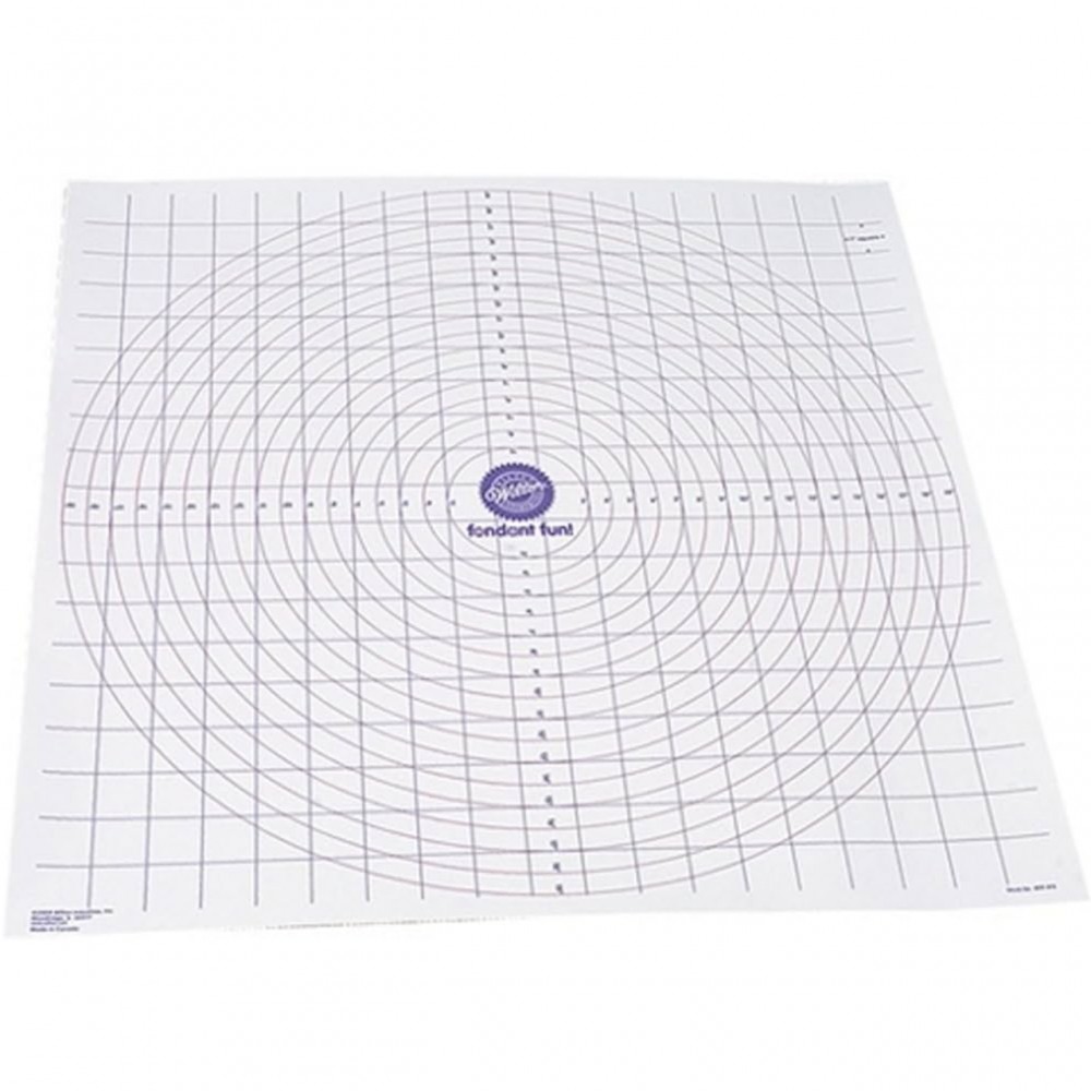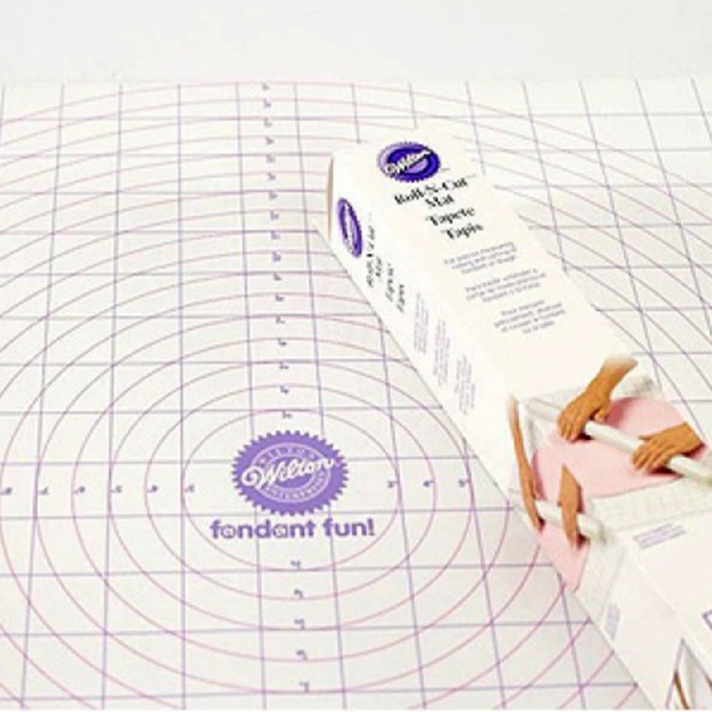 Подложката Wilton Roll N Cut е удобна работна повърхност за измерване, разточване и рязане на фондан, марципан или тесто. Предварително отпечатаните кръгове и линии ви позволяват да определите правилния размер и да изрежете право. С този килим можете да покриете торта с размери до 10 x 35,5 см.