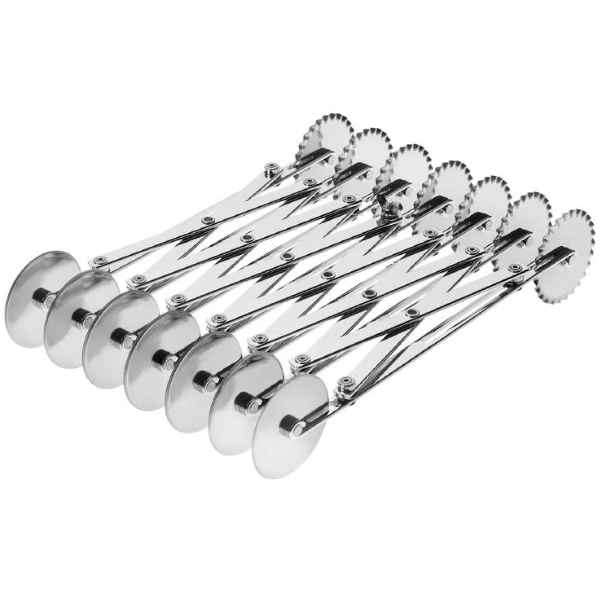 Спестете време и усилия с раздвижения нож с 7 колела. Той е идеален за рязане на сладки, бисквити, сладкиши и всякакви тестени изделия. Изработен е от неръждаема стомана и е италиански продукт, което гарантира високо качество. Разполага с заключващ механизъм, който позволява да регулирате с максимална точност начина на рязане и същевременно да постигнете равномерни и прецизни резултати.