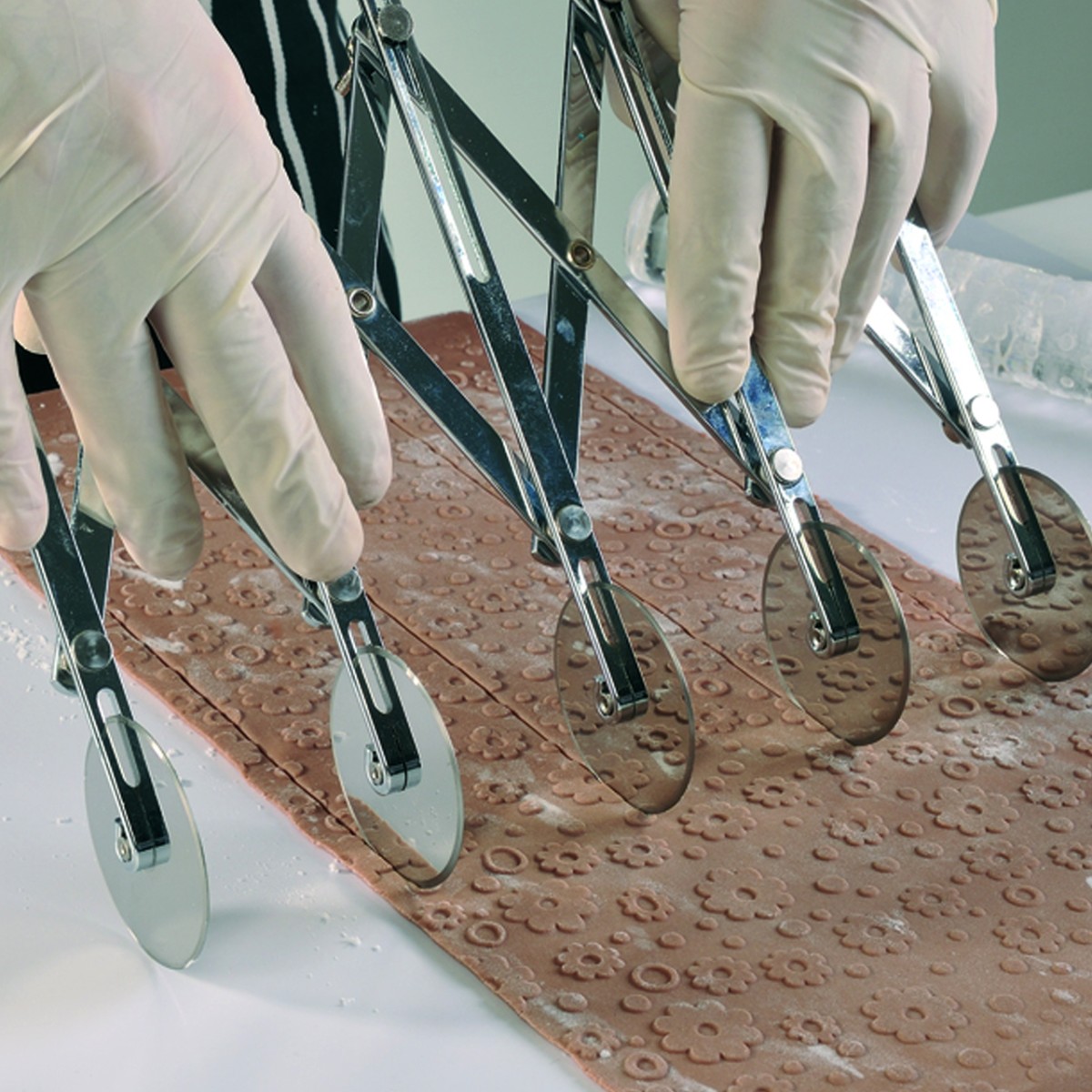 Професионален нож с 5 гладки и 5 назъбени колела от двете си страни, изработен от висококачествена неръждаема стомана с антибактериално покритие. Идеален за рязане на тесто, сладки, бисквити, кори и сладкарски изделия с различна текстура и ефект на рязане.