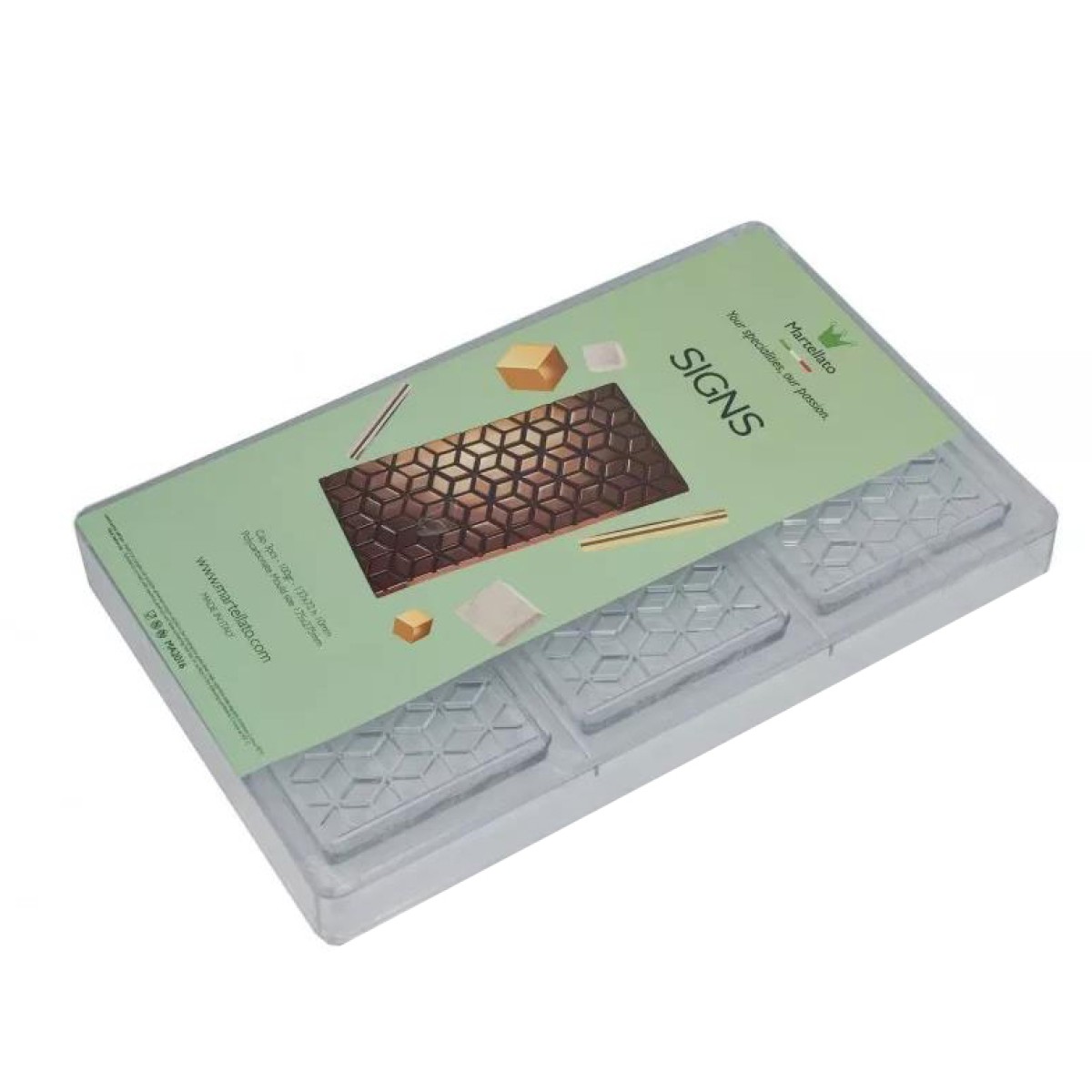 Поликарбонатна форма, подходяща за шоколади или пълнени бонбони. Поликарбонатните форми са изключително здрави и качествени и се почистват лесно. Работи се лесно с тях и са практични, защото може да се редят една върху друга в хладилника, без да повредите самите бонбони.