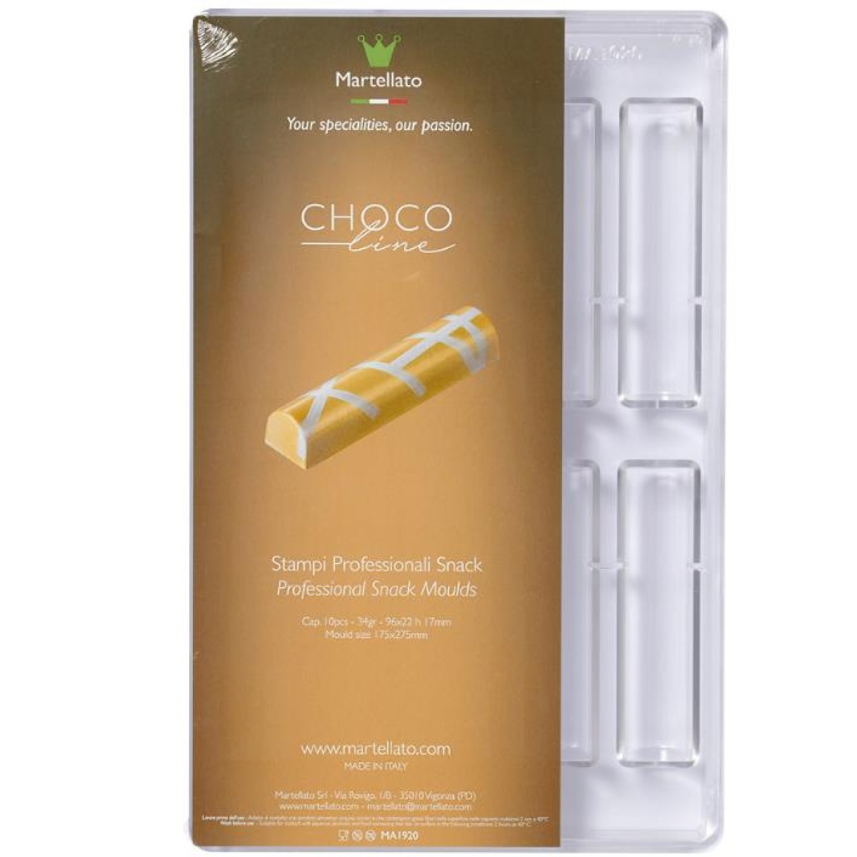 Поликарбонатна форма, подходяща за шоколади или пълнени бонбони. Поликарбонатните форми са изключително здрави и качествени и се почистват лесно. Работи се лесно с тях и са практични, защото може да се редят една върху друга в хладилника, без да повредите самите бонбони.