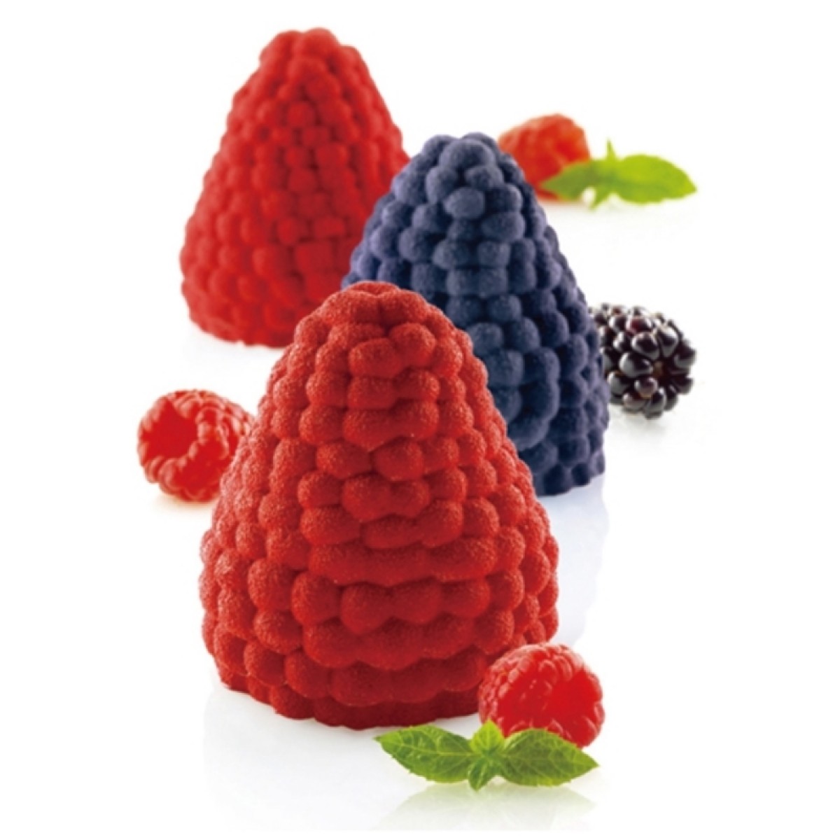 Силиконовата форма "Mora Lampone" е част от разнообразни дизайни, които идеално пасват както на гастрономни.Формите са от висококачествен силикон, 100% подходящ за контакт с хранителни продукти. Могат да бъдат използвани за печене и замразяване. Идеални са за професионална употреба в сладкарството, производството на сладолед и Хорека. Гарантирани са над 3000 ползвания и след употреба може да бъде измита в съдомиялна машина.