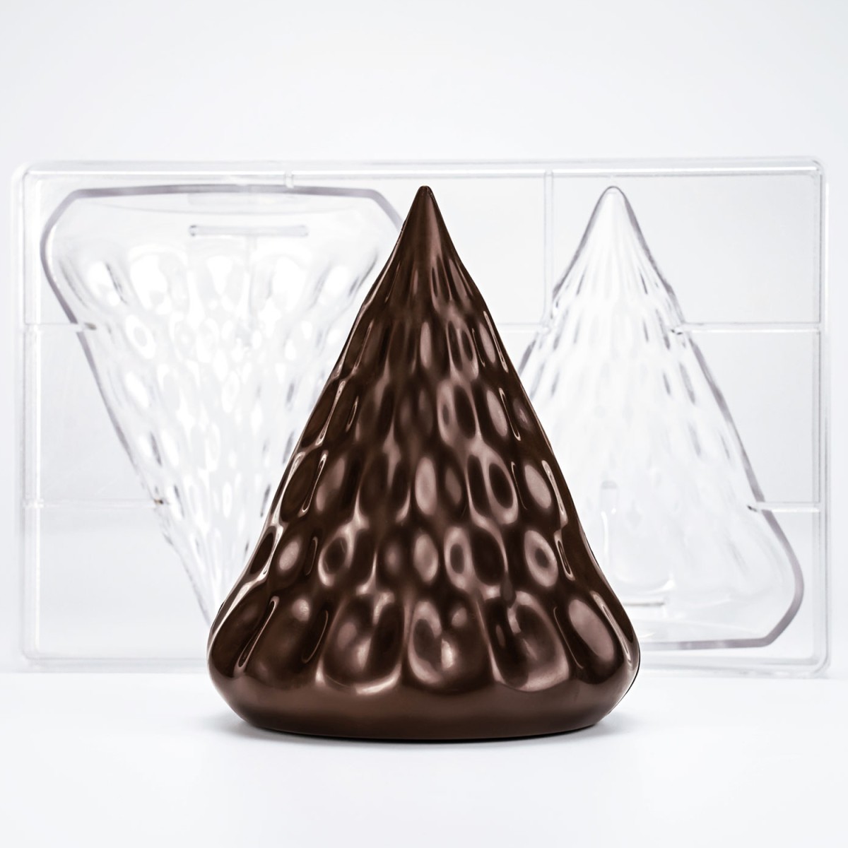 Поликарбонатна форма, подходяща за шоколади или пълнени бонбони. Поликарбонатните форми са изключително здрави и качествени и се почистват лесно. Работи се лесно с тях и са практични, защото може да се редят една върху друга в хладилника, без да повредите самите бонбони.